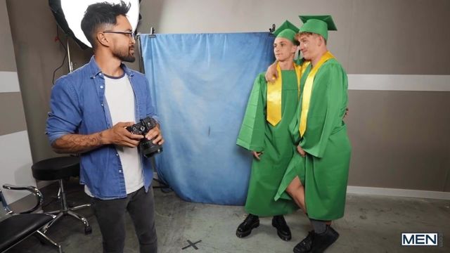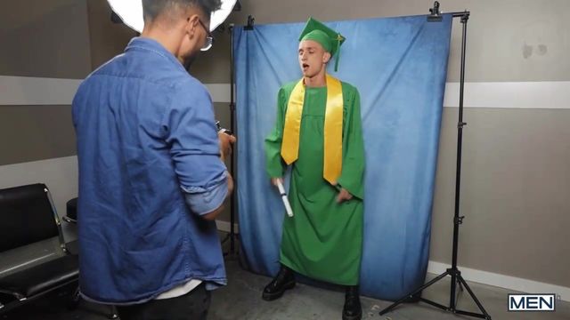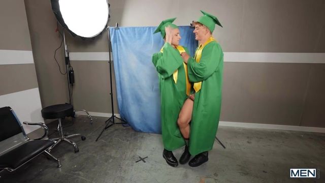 Twink Theo Brady is waiting in line for his college graduation photo, but somehow he ended up with a backless gown! To make his buddy feel better about his ass hanging out, Felix Fox flashes his dick, and Theo crawls under Felix's gown to suck it. Felix tries to keep it together for the pics as Theo surreptitiously swallows his cock. He gets his revenge as Theo poses by slipping his cock through a slit in the backdrop and fucking Theo doggystyle. As soon as the coast is clear, the guys get naked and Felix fucks Theo on the stool, spinning him to fill his hole mish then penetrate his mouth. The guys flip fuck as Felix goes down on Theo, then rides his cock, and the shaven-headed grad fucks his blond buddy missionary till they both jizz all over their mortarboards!