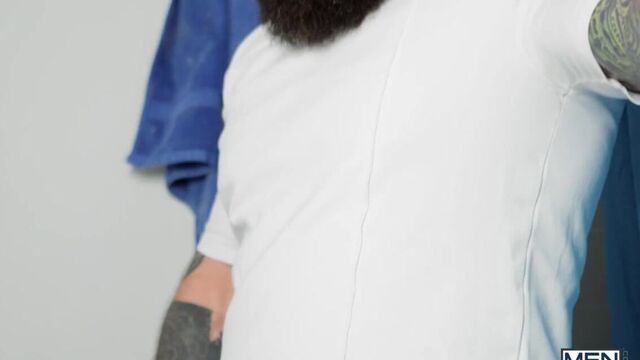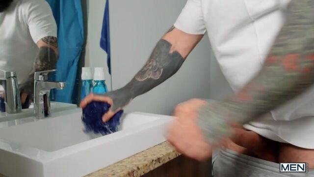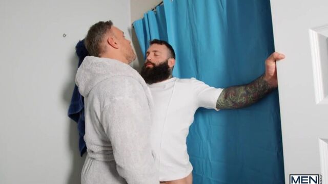 After his mom kicks him out in the middle of the night, twink Ryan Jacobs goes to stay with his dad Alex Mecum, but even more than the hospitality, he wants some of Alex's boyfriend, Markus Kage. Ryan sucks Markus's cock in the bathroom, but the horny twink has to hide in the shower when his dad comes in. But Alex is also horny for some shower sex in the morning, and Markus is caught in the middle! Markus goes down on Alex, then Alex rims him. Markus sticks his cock through a hole in the shower curtain, where the waiting Ryan sucks it as Alex fucks Markus doggystyle. The scheming stepdad bends Alex over and fucks him, and Ryan rips an even bigger hole so he can penetrate Markus doggystyle, cumming on his hairy ass just before Alex blows a massive load. Markus gives Alex a facial, then sends him out for fresh towels, giving Ryan a chance to slip away.