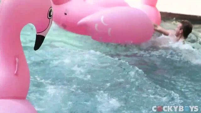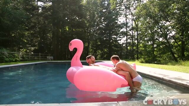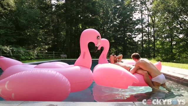 Dillon Rossi loves to play -- he beams with positive energy both inside and outside the bed sheets. So when he first met Damian Black, still a relatively new CockyBoy, you know he had all sorts of games and activities lined up for them as the summer winded down. They had a raft race in the pool, skipped rocks, and played a rather intense game of paddle ball. Something about their competitive nature was just so fucking sexy for some reason... so when Dillon abruptly leaned in and kissed Damian in the pool, it was smooth and effortless.Just as sensual as he is playful, Dillon suggested he and Damian suck each other off while balancing on a pool raft. It took them a couple tries, but before long they were giving each long, deep blowjobs on a wayward inflatable flamingo. At one point, Damian was actually able to get on his knees and face-fuck Dillon for a bit! With things heating up, they moved back into the water where Dillon leaned over the edge and let Damian slide his thick cock inside and fuck him doggy-style.Not one to shy away from adventure, Dillon suggested he ride Damian... while floating adrift in the center of the pool. So Dillon brought back his trusty flamingo and made it happen, rocking back and forth on Damian's dick with the help of the pulsing water beneath. When their fucking intensified, though, gravity took over and they both plunked into the water. Dillon then suggested a more comfortable area in the shade to finish off, but it was Damian who suggested they bring their flamingo with them! So they set the raft on the grass as Dillon laid back and let Damian pound him face-to-face all on the comfort of the bouncy inflatable. Dillon quickly shot his load first and Damian produced quite a cumshot a little later on Dillon's pecs. The perfect end to a day of fun, fucking, and inflatable flamingo floats... what more could you ask for?Enjoy,Jake Jaxson