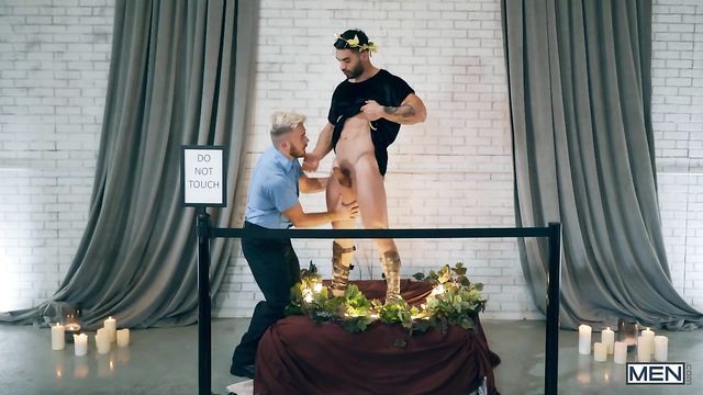 Finn Daniels is bored with his job as a museum watchman. The hours are long, the pay is terrible and (worst of all) the art is derivative. However, just when he's thinking of giving up and going back to flair bar tending school, the blonde hunk discovers that the latest installation might have more to it than meets the eye. When Finn gets too close to an alarmingly lifelike sculpture of Arad Winwin, the hairy-chested guard discovers that he might not be the only one bored in the gallery. Arad reminds Finn that for art to work for you, you have to work for art and offers the bored blonde his throbbing cock. Finn worships Arad's cock, letting the chiseled dark-haired stud fuck his mouth and hole all over the gallery until Arad blows his hot load all over Finn's eager face.