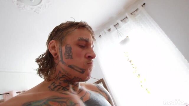 When Bo Sinn's upstairs neighbor Milo Mandera wakes him up early on a weekend with the noise of his workout, banging his baseball bat against the ceiling does nothing to stop the noise, so Bo marches up the stairs and pounds on the door. When Milo lets him in, Bo puts him up against the wall and tells him to cut out the noise, but Milo just leans forward and kisses him! Bo tosses the bottom on the couch and rips open his shorts to spank Milo's ass, then feeds him his cock. Milo rims the top and sucks that huge dick, then lies on the floor to take it doggystyle. Bo works the bottom out as he fucks him nice and deep, and Milo rides him on the couch, then pounds him deep in mish. Milo asks for even more of that dick as he strokes himself till he cums, then Bo jizzes all over him.