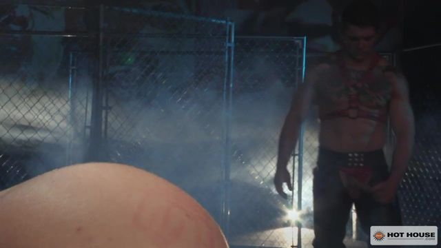 Inked up and decked out in leather, Sebastian Kross is wandering around the sex club when he sees sexy Jacob Peterson showing off in a tight black jockstrap. Sebastian sets his sights on Jacob, who bends over to expose his smooth sexy ass. Jacob's tight hole becomes Sebastian's target, and he moves in, gets down and shoves his entire face between Jacob's ass cheeks. Spitting and licking on Jacob's eager center, Sebastian tugs at his cock through his leather chaps and jockstrap. After teasing Jacob's hole with his massive member, Sebastian crams every last inch of his cock into Jacob's throat as he lies on his. Sebastian contorts Jacob's legs in the air so that he can munch on his ass some more while Jacob continues to sucks Sebastian's cock. Jacob's hole if fully prepped and he can't wait any longer, so he gets on all fours and lets Sebastian dick deep into his hot center. Sebastian works up a sweat as he slams Jacob's asshole in multiple positions. While taking an intense pounding on his back, Jacob shoots his cum all over his body and Sebastian pulls out and unloads all over Jacob's cock and nut sack.