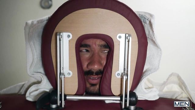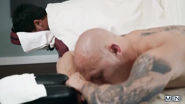 Trevor Laster doesn't like the look of the spa that his boyfriend picked out for their massage together, but when he sees the hunky masseuse (Mateo Fernandez) he changes his tune. Mateo massages the muscular hunk, rubbing his hands all over Trevor's huge muscles as his boyfriend watches jealously. However, things get even spicier when Mateo starts to work on the tightness in Trevor's ass. Mateo oils up the tattooed stud's sweet hole and starts to give him some very deep tissue massage. When Trevor's boyfriend realizes what's going on he storms out, giving Mateo free reign over the shaved headed hunk. Mateo works him over from top to bottom, fucking the cum out of Trevor with his thick uncut cock.