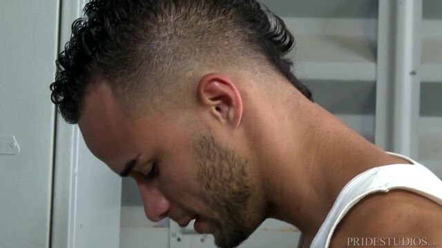 Tommy is at it again and this time he's beating off in a public locker room hoping to get caught. Tommy is smacking his dick on the lockers and yoga mats just waiting for an unexpecting patron to coming walking in. Javier has no idea what he's walking into but he sees Tommy turn around quick when he comes into the locker room. He only got a glimpse of that big dick and now is curious about it. Tommy acts sorry that he got caught but he's really not. Javier wants to see the goods now that he's been caught red handed. Tommy flops his big thick dick out and Javier can't believe how big it is. He grabs it with both hands stroking it and also examining how fat it is. Tommy moves it closer to his mouth and now Javier takes it inside and loves the taste of it. He can feel the precum on his tongue as he licks Tommy's shaft up and down. He has to use both hands with this thick heavy meat. Tommy isn't selfish at all and begins to blow Javier's sexy uncut dick. Two big cocks in one locker room is a sight to see. Tommy is vocal and eager to see that ass so he turns Javier over and spreads his ass wide open to dive his face right in between those firm hairy cheeks. Tommy is in heaven as he rims that tight eager ass of Javier's. That ass is dripping with spit now so Tommy grabs hold of Javier's hip and pushes his big dick balls deep into that sexy ass. Now he's fucking him really good making sure he takes care of this big dick that will have cum ready to blow soon. Javier rides that massive cock also sliding up and down. You can see just how meaty this dick is as it squeezes deep into his ass. Finally Tommy gets him on the ground and piles deep into him hard and fast until Javier can't take it anymore and cums all over himself with Tommy's hard throbbing cock inside of him.