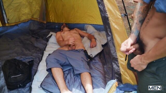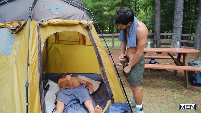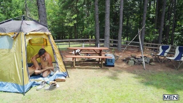 Ty Mitchell and Dante Colle are on a camping trip with their boyfriends, but things aren't going entirely to plan. First Dante has to set up the whole campsite himself then he finds out that the other men didn't bring any food! When Dante finally gets a minute alone he decides to make the most of it, sneaking in a quick jerk off session while the other guys are looking for firewood. Ty can't resist when he comes back early and sees Dante stroking his cock in the tent, he takes his dick out and joins in. Dante realizes he's being watched and tells the athletic cutie to join him for a hot and heavy private moment. The two horny outdoorsmen trade blowjobs, sucking and licking each other while their boyfriends are away. Ty can't take it anymore and demands Dante's dick in his ass, riding the bearded stud until they're both ready to blow their huge loads.