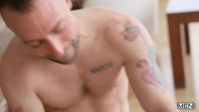 Jeremy London is preparing a meal, but his husband, tall, shaven-headed hunk Travis Connor, wants to eat his ass for dinner instead. Jeremy tells Travis they don't have time since their guests are due any minute, but after Jeremy gets his hand stuck in the sink, Travis seizes his chance to pull down his hubby's pants and rim him right under Malik Delgaty and Finn Harding's noses. He oils up Jeremy's hole and fingers him before oiling up his hand and getting it free. The guests look on in surprise as Travis fucks his husband missionary on the dinner table and stand-and-carry up against the wall, but when the guys move to fuck on the couch, Finn and Malik join in the fun. As Travis sucks Malik, Jeremy sucks Finn's cock, then takes the guest's dick. The bottom rides Finn before cumming all over his chest as the top penetrates him in doggystyle. Finn's not done yet, putting Jeremy on his back on the couch and fucking him nice and deep before cumming on his face. This dinner party is just getting started...