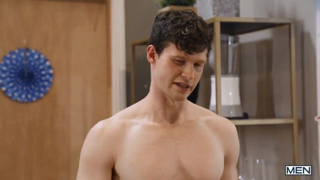 Finn Harding's calm Fourth of July sunbathing is interrupted by loud voices from the frat guys of Alpha Cum Laud next door. He peeks through a hole in the fence, and the sight of curly-haired blond Felix Fox's muscular body in nothing but a skintight bathing suit makes him want to keep watching. Felix catches his hot neighbor peeking over the fence and pokes a hot dog through the hole, so Finn decides to put his cock through next! After Felix strokes it, Finn comes over, and the guys start a game of dick pong before heading inside where Felix squirts mustard on Finn's "sausage" and swallows it down. Felix bends over the table and Finn eats his ass, then fucks him doggystyle. Finn feeds the twink a hot dog while pounding him missionary on the table, then fucks him deeply on the floor in piledriver. Felix rides the sexy top reverse as he slides his own meat into a bun before cumming and then takes a hot facial. Happy Independence Gay!