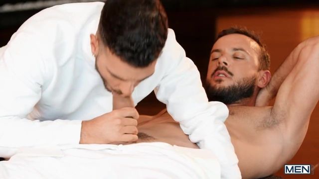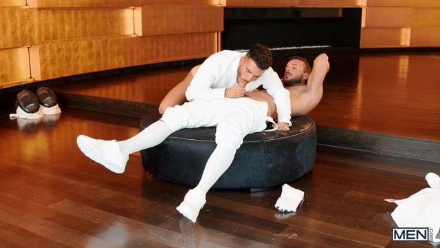 Master fencer Sir Peter doesn't need to disarm his opponent Pol Prince when he can pull off his pants and expose that his cock is hard. Pol isn't the only one: Sir Peter's other sword is also ready and waiting, so the guys take off their helmets and come together in a steamy embrace. Pol rubs their dicks with his gloved hand, and the top rims him before Pol blows Sir Peter. Pol rides the top and Peter penetrates him in spoon, then puts him on all fours to fuck him doggystyle and enjoy his victory. He fucks Pol missionary, then the bottom rides Sir Peter until he cums before eagerly receiving the top's load in his mouth.