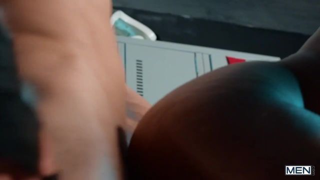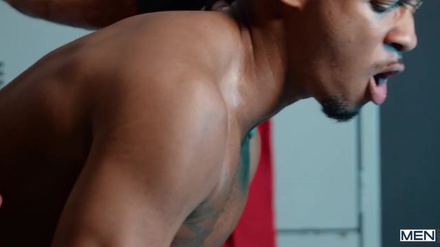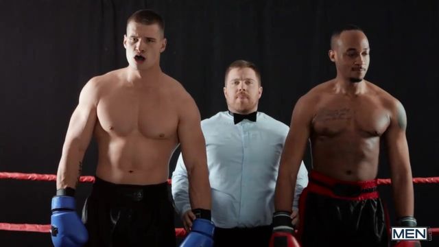 During their pre-fight interview, Malik Delgaty surprises the reporters, managers, and especially his opponent, Trent King, when he leans forward and kisses him on the lips, then takes off his robe to reveal a huge boner tenting his boxing shorts! After Malik delivers a knockdown in the ring, he consoles Trent with his cock in the locker room. Trent sucks the champ's big dick, then Malik fucks him doggystyle. The top lies back on a bench so Trent can ride him, then bends the bottom over against the lockers. Trent takes it deep in missionary lying back on the bench, and in this match he cums first before Malik gives him a facial.