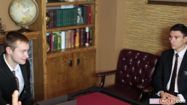 - Description: Now that handsome, young Elders Berry and Titov are out of danger, the brethren would like to talk to them about their experience. But when the two hot missionary boys get to the bishop’s office and knock on his door, there’s no response. “Let’s poke our heads in,” Elder Berry says. Elder Titov protests, but Elder Berry opens the door and sticks his head in. They have the room to themselves, and Elder Berry sees a familiar object. He steps into the room and points out the priesthood stretchers — two benches lined with dildos of increasing size. “I can’t believe it,” he says. “It’s the same thing.” He touches the tip of one of the dildos with a finger, remembering how scared he was when he first saw it in a dark basement… Elder Titov reaches down and plays with one of them, too. Just seeing the bench, he can feel all over again the fat dildo sliding up his tight ass. Too see all of what happened in that dark basement, go to DreamBoyBondage.com. (This is a hard core bondage site, so be warned! It’s pretty rough stuff!) The elders snoop around the bishop’s desk, which has a soft top and a metal rail around the perimeter. “This is a weird desk,” says Elder Titov, while Elder Berry opens one of the drawers and pulls out a small box. Inside the box is a big floppy dildo. The bishop seems to be some kind of pervert. Elder Berry plops the dildo down on the desk with a laugh. “What’s this?” Elder Titov sits down. He finds all of this confusing. Elder Berry smirks. “Clearly the brethren are ok with what’s going on. Otherwise they would have come and rescued you.” Elder Titov is silent. He has always had unshakable faith, and it’s hard for him to believe his priesthood leaders could be involved in the sadistic sexual humiliation he underwent. But he doesn’t know what to make of all these sex toys in the bishop’s office. “You know, when I got back here to the mission home, they had me take my clothes off and used one of these on me.” He has a huge smile on his face. “I liked it.” Elder Titov leans forward in his chair. “What do you mean, you liked it?” Now that Elder Titov has heard about his hot companion taking a dildo up his ass, he wants to see it for himself. He can picture the boy’s tight little butthole opening up and swallowing the fat cock. His own dick is starting to get hard. Elder Berry suctions the dildo to the desk. “I’ll show you. You’ll like it too.” Elder Berry stands up and starts to take his clothes off. Elder Titov is a little shocked — the bishop could come back at any moment. Then again, the office is full of sex toys. “What are you doing?” he hisses at Elder Berry, who just smiles and keeps going. He sets his jacket down, then takes his companion’s tie off. Elder Titov sits still, unsure what to do. He lets Elder Berry unbutton his shirt, letting his eyes travel down his chest to his crotch. Then he reaches out and pulls off his belt. Elder Berry pulls him to his feet and takes his shirt off. It’s hard for him to believe how hot his companion is. His abs look like they are sculpted in stone. He looks back at Elder Berry with those puppy dog eyes, and Elder Berry impatiently opens up the boy’s pants. He shoves a hand down the front and wraps his fingers around his hard dick. “I knew you’d like it,” he says with a smile. As he plays with his companions cock, he reaches into his own pants and gropes his own boner. He slides his companion’s pants to the floor, and then drops his own. Elder Titov lifts up his garment and gives his companion a look at his perfect body. Elder Berry gently strokes his dick, then strips off his own shirt, revealing his lean torso and the sprinkling of hair on his belly. Elder Titov can’t resist the urge to put his hand on his companion’s dick, and Elder Berry returns the favor. As they grope each other, Elder Berry grins. “That feels good, and I haven’t even shown you this toy yet.” He hands a toy over. “Here, hold this.” Elder Titov holds the dildo in his hands while Elder Berry squirts lube on the other, drops his garment bottoms and lies down on the desk. He strokes his fat dick as he teases his hole with the toy. Elder Titov watches the head of the toy press against his companion’s asshole, totally transfixed. Slowly, Elder Berry pushes it into his ass, moaning as it enters him. Elder Titov, remembering how it feels, and seeing the pleasure on his companion’s face, is getting very turned on. Elder Berry pushes it in deeper, taking a deep breath. “Does it really feel good?” Elder Titov asks innocently. “When I was on the board, it didn’t feel that good.” “You just have to relax,” Elder Berry says, feeling a little dizzy with pleasure. He really wants to see his companion take one up his ass too. He figures the only way to convince him is to show him how much fun it is. Elder Titov sits down and plays with his dick, his eyes locked on his companion. The dildo is really long, and Elder Berry pushes it all the way in and leaves it there for a second. He strokes his dick and thinks about Elder Titov feeling what he’s feeling. At his command, Titov takes off his garment bottoms and teases his hole with the toy. The head is cold and slippery, and it feels weird against his butt. Weird, but good. He applies a little pressure, and pulls out his chubby. “Show me your ass,” Elder Berry says, and Titov turns around. Looking at his tight butt gets Berry really hard. He’s stuffing himself with the dildo and jerking hard. The sounds Elder Titov makes as he feels the toy just beginning to enter his hungry hole make Berry feel crazy with lust. He closes his eyes and rides the edge just for a second, and then he can’t control it any longer. With a load groan he feels a load of cum explode from his hard dick. The sight of all that cum makes Elder Titov’s balls ache. Elder Berry smiles, sits up and puts a hand on the 
