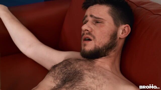 Blond top Tim is very unimpressed when bearded bottom John D arrives, but John won't give up that easily. He follows Tim upstairs and shows off his hairy body for him in a tease, unbuttoning his shirt and pulling down his pants, then kneels next to him on the couch and rubs his ass. Tim is finally tempted enough to spank John's ass, and the bottom sits on his face! The guys suck each other's cocks and Tim slaps John's face, then fucks the bottom doggystyle. John rides Tim's big dick and the top fucks him spoon on the couch before lying him down on his back to fuck his ass missionary. Tim pulls out to cum, then slides his cock back inside to give this bottom what he wants as John jacks himself off till he orgasms.