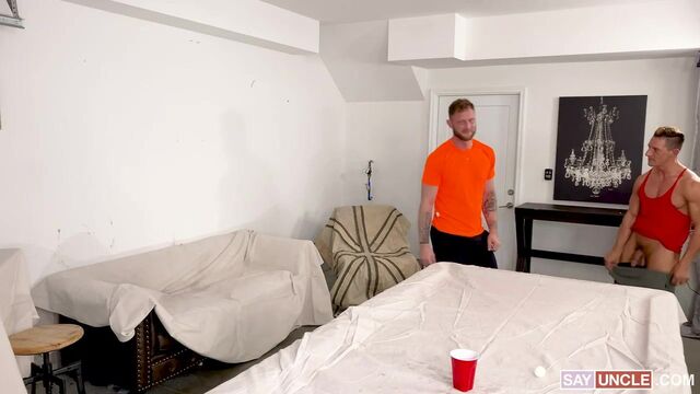 Jax Thirio challenges his friend Gunnar to a water pong challenge, betting some money on the outcome, but when Gunnar loses, Jax proposes a more devious kind of bet… the loser will have to suck the winner’s dick! Gunnar says he’s not into that gay stuff, but Jax explains that’s not the point and proceeds to crush Gunnar again on the challenge. Turns out Gunnar is way more into that gay stuff than he claimed when both men end up naked and cumming on the couch!