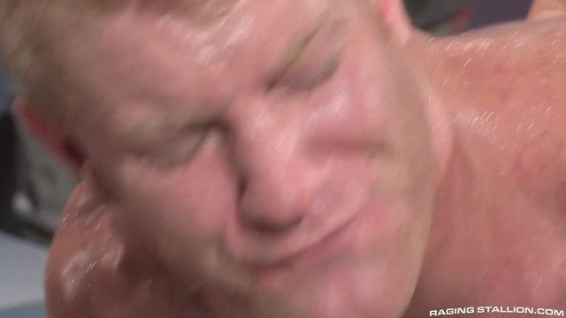 Huge muscled torsos of Johnny V and Landon Conrad compare to the muscle cars in the Auto Erotic Shop. And Johnny's smooth muscled chest contrast to Landon's hairy pecs. Their sexual chemistry is high octane fuel just waiting to be sparked and ignited. Their cocks crowd their jeans; their lungs can barely sustain the heavy breathing. Landon smashes their dicks together in a single hard column and jacks ferociously before dropping to his knees to give Johnny a deep blow job. Johnny responds in kind, punishing his throat on Landon's hot meat. Spreading the cheeks of his muscled ass, Johnny sits on Landon's face and the sexual RPM go into overdrive. Sweat pours down the cleft in Johnny's chest and down his backbone to the crack of his ass. Johnny is an inspired, energetic power bottom, and he alternates between sitting on Landon's face and opening his hole to Landon's perfect endowment. Totally in his element, Johnny rides Landon until neither of them can contain the massive loads that have built up from this feverish exchange.