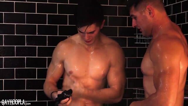 Zach Douglas loses anal card to Max Summerfield's big thick cock. Zach came home from the gym and hopped in the shower with Max. After watching each other, Max wanted to lock lips with Zach. After some sensual kissing, they got down to their knees for some blowjob action. Max was ready to try Zach's cock in his ass, so he bent over and asked nicely. Zach fucked him in a few different positions. Max loved it and made him cum earlier than he'd hoped. Max took the opportunity to switch things up and offer Zach his first cock. Thrown against the wall like a scene out of a jail flick, Zach asked Max to move to the bed instead for his initial entry. Zach jumped on top of Max, ready to ride him for very first time. The facial expressions say it all. Zach felt Max's cock slide into his ass so gently. After some nice soft fucking, the mood changed quick. Zach was starting to really enjoy the dick and wanted to be pounded. Starting to really get into it, Max could feel himself pre-cumming. Harder and Harder, he hammered and dropped a load all over Zach's stomach. Zach buddy, your ass is now ours, we welcome your hole to GayHoopla.
