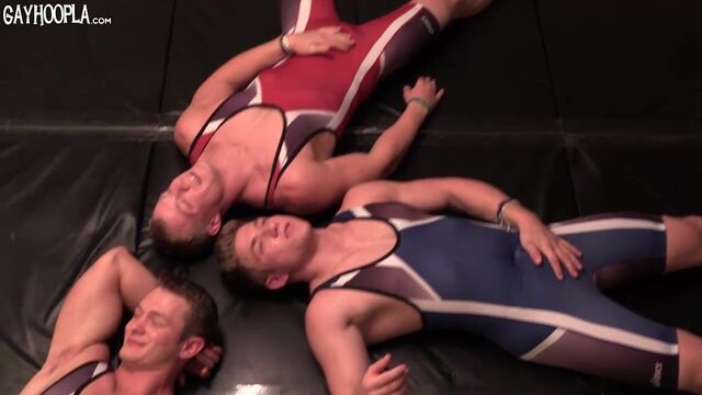 Lots of you all have asked to see some wrestling action here at GayHoopla. We have Colt Mclaire, Tyler Hanson, and Daniel Carter Wrestling in singlets. These guys did some warm-up stretches and back-tracked to an old high school teacher they all had a crush on. After some wrestling, the guys started chatting away about an old crush which made them horny. They took there singlets partially off and jerked it all in her honor.
