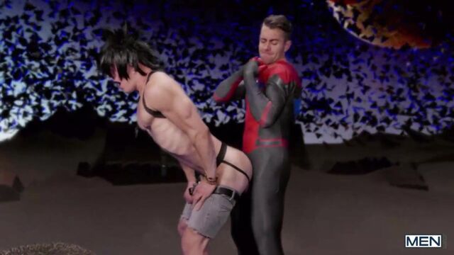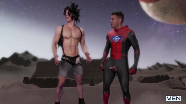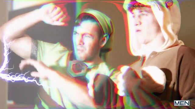 There are still some kinks to be ironed out of the new Anal Cumbat arcade game when con-goers Dante Colle and Felix Fox get sucked inside the virtual world. The gamers are shocked to find themselves dressed as the characters... and equipped with huge cocks! After defeating an enemy with their jizz weapon, the game world looks like it's cumming to an end, so Felix asks Dante to take him doggystyle. The guys start fucking and get transported back to the real world. They find an empty room at the con to continue their tryst, as Dante bends Felix over the table before they suck each other's cocks. Felix rides the top, then takes that dick deep in missionary. The security guard comes in to watch and decides to take a facial from both of them!