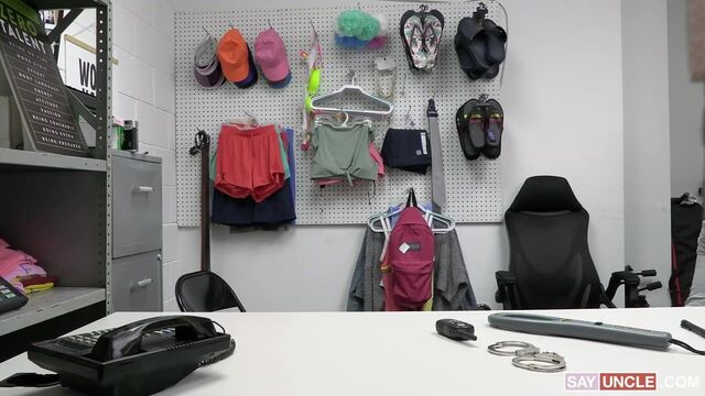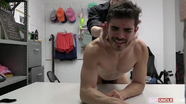Security officer Cole Church brings Cazden Hunter to the backroom for some serious questioning. Officer Church claims that customers have been complaining of strange noises coming from the bathroom, and Cazden is the number one suspect. Cazden confesses that he was masrtubating so Officer Church decides to teach him a lesson and submits him to a deep cavity search that he’ll never forget.