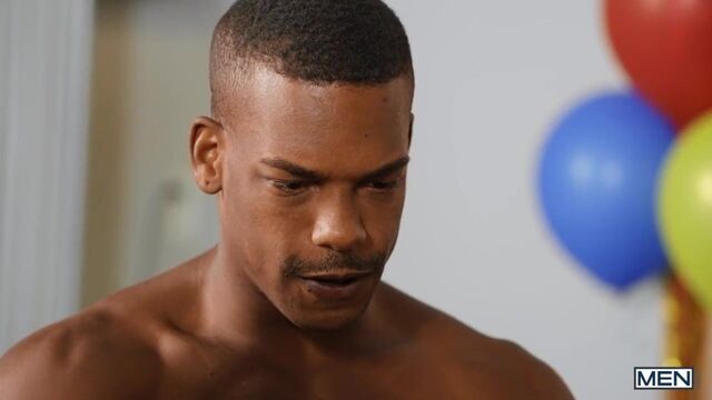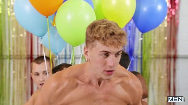 Felix Fox's buddies have got him a special surprise for his birthday bash: Michael Boston, who jumps out of a wrapped present wearing nothing but a pair of tight briefs and a bowtie to give Felix a lap dance. But before things get really hot and heavy, first it's time for flirty party games. Felix pins the dildo in Michael's hole, and Michael wins the right to suck Felix's cock at the wheelbarrow race. When the guys play naked musical chairs, Felix is the last to sit down when the music stops... but he hops on Michael's cock, making him the real winner. The guys serve Felix his "cake": Michael's muscle ass covered in frosting! Felix eagerly devours it before the guys enjoy a birthday flip fuck while Felix's friends watch and stroke their cocks. After pounding Michael's ass and getting pounded to boot, Felix lies down on the table to take four hot loads in a birthday bukkake!