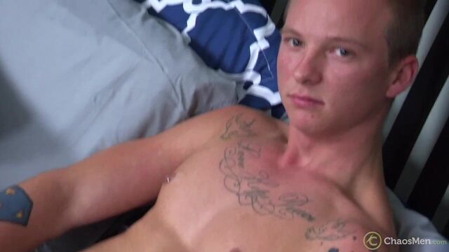 Inked-up blonde guy jerking off furiously for the camera - Chaosmen