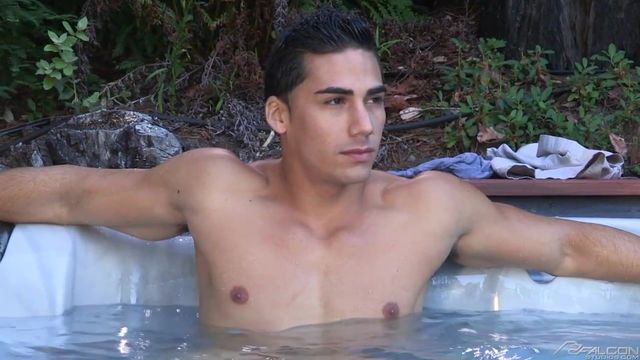 Topher DiMaggio strips, and a hawk circles as his magnificent body comes into view, one discarded item of clothing at a time. He slides into the hot tub. Sean Zevran got a hawk's-eye look at Topher too, and it's got him turned on in all the best ways. You feel the lust when Sean and Topher make eye contact. Sean steps into his tent fully clothed only to emerge fully nude seconds later. Sean poses, cock twitching, for Topher to drink in the view. Then he enters the tub. Watch them above and below the water line: they lock thighs, cross hands to jack each other's cocks, and kiss like lovers. Blow jobs are traded. Sean works under water; Topher works above, with a thumb pressing Sean's taint and a finger in his ass. Topher tongues Sean's muscular ass and rubs his cock along the crack before they start to fuck. It's tough and tender and everything that undeniable electricity promised. Sean's orgasm, while Topher is still fucking him, leaves his sculpted torso covered with semen; Topher's ejaculation is torrential.