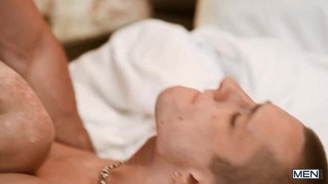 Have you been waiting for your chance to hook up with hot Men.com twink Theo Brady? Get the next best thing as you follow Theo through his favorite haunts as he poses under the bright neon lights of the city, then leads you to a luxurious bathroom where he strips down and caresses his cock in the bath. Reese Rideout is waiting just outside the door for him, and the pair make intense eye contact before he kisses Theo's abs and sucks his dick. Theo lowers himself onto Reese's hard cock, riding him on the bench before the top puts him up against the wall and fucks him doggystyle. In the bedroom, Theo blows Reese, then takes him deep in missionary. Reese pounds the bottom's ass in spoon until Theo moans with his orgasm, then Reese pulls out and cums.