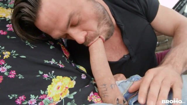 When James Fox sees sexy hitchhiker Bo Sinn by the side of the road, he decides to pick him up over his boyfriend Thyle Knoxx's objections. Thyle goes for a nap in the back, so Bo takes the passenger seat and takes out his huge dick with a naughty wink. James pulls over so he can suck Bo's cock, and Bo blows James in return. When Thyle catches the tattooed hitcher rawing his man doggystyle, he takes off in disgust! The horny guys head outside, where Bo bends James over against the side of the camper, then James rides Bo's cock. The bottom lies down in the lush grass to get his ass pounded in missionary till he cums, then takes a facial. But James is about to find out why picking up this hitchhiker was a mistake...