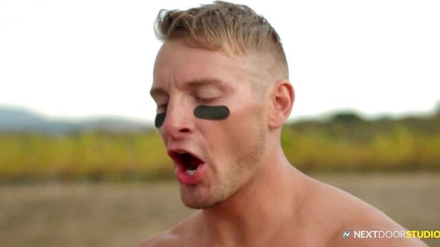 Ushering in the start of the new season, teammates Jake Karhoff and Hunter Stone have decided to engage in a friendly little competition. QB Jake has wagered that he looks better in his uniform than tight end Hunter, who takes issue with this challenge, since he's been hitting the weight room all off-season. Hunter is convinced his hard work and hard body will win him the bet, but once he sees Jake in his tight pants, he's less concerned with winning the battle and more concerned with a different reward- seeing what's underneath Jake's uniform. Jake is likewise confident his hard work will put him over the top, but when he sees his receiver dressed in full fatigues he also abandons the spirit of competition in lieu of something a little more collaborative, as he and Hunter embrace and slowly strip out of their gear. Jake drops to his knees, unlacing Hunter's pants and grabbing his package, then licking it up and down before full on deep throating it. Hunter returns the favor, going down on the quaterback before bending over and letting Jake have his way with him.Jake pounds Hunter against a bench, surrounded by fall foliage and the setting sun, and Hunter closes his eyes and takes every pleasurable inch of Jake's offering, stroking himself off as Jake pounds away. Jake sprays his load all over Hunter and then pulls out and sucks him off, swallowing every last drop as Hunter convulses from the sensation. As both guys wipe the sweat from their brow and watch the sun's final light descend the horizon, they concede that everyone here is a winner.