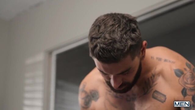 Have you always wanted to experience hooking up with your favorite Men.com stars? Try the next best thing, as bad boy hunk Chris Damned shows you just what he likes. Chris sneakily teases you in his office, rubbing the bulge in his pants as he unbuttons his white shirt to show his tattooed chest. He undresses, sniffing his shoes and socks before licking his own toes. As Chris jacks his long, thick cock, he notices twink Joey Mills watching him and wordlessly invites him to join in. The dominant top undresses Joey, kissing him and blindfolding him with his own tie before fucking his mouth. Chris rims Joey's hole, then fucks him missionary on the desk. The twink bends over the bookcase to get fucked from behind, then rides Chris in a chair. The horny top pounds Joey in piledriver, making him cum, then pulls out to shoot his own hot load in Joey's gape!