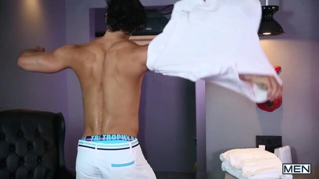 Aspen is late and fearful of his scornful boss. He runs off just in time to miss housekeeper Diego Sans entering his room and discovering his dildos. Aspen bursts back in to retrieve his phone, but Diego won’t let this moment go to waste. Pouncing on the straight boy, he gets exactly what he wants.