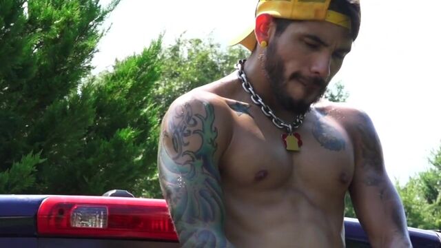 - Description: What is a hot stud to do on a beautiful day in North Carolina? Draven Torres is a hot, muscled stud with a number of tattoos on his chest and arms. He knows that washing his truck is always a tough chore under the hot sun. Stripping down to his briefs and washing his truck seemed like a good way to make this big job a little more enjoyable. This sexy tattooed hunk is an amazing sight as he gets sweaty bending over to ensure that he washes every surface of the truck. With his hat turned backwards, Draven must be feeling a bit dirty and decides to soap himself down with the sponge. With a sponge in one hand he uses his free hand to reach into his briefs and start stroking his cock. That has him horned and ready for some fun so he hops on the back of the tailgate to start pleasuring himself. While tugging on his balls, he starts long stoking his thick cock and gets more excited with each stroke. He moves to the back of the truck and strokes his erect cock, watching himself in his reflection of the windows on the cab of the truck. While using one arm to grab the truck he watches himself caress his chest and moves his hand down to his hard throbbing cock. Spitting into his hand, he starts fingering his hole while continuing to stroke his thick cock. This hunk sporting a hard cut, tatted body squats to take his fingers deeper into his tight man hole. He continues to be turned on watching himself on the reflections of the truck windows stroking his dick. The sight of his hard, sweaty body glistening in the bed of the truck while he strokes his cock is an amazing sight. Draven lies down on the truck bed’s tailgate to continue stroking his thick shaft. He rubs his hard cock and plays with his balls as he gets closer to working out that giant load of cum. Firm gripping that cock, he strokes out a huge load of cum that land all over his chest and legs. Draven explodes in deep moans as he milks that giant load all over himself. Draven will definitely need to hose himself off and the truck off after shooting that massive load.