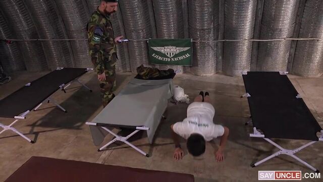 When sergeant Joris Leonard goes to check up on cadet Vincent Landi he finds him still sleeping in his cot, so he wakes him up immediately. Sergeant Leonard finds some used tissues under his covers along with his phone playing gay porn. Cadet Landi knows that pornography is not allowed on the base so Sergeant Leonard punishes him by fully pounding his hole!