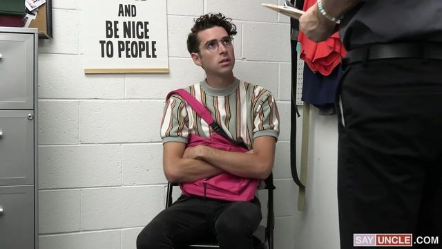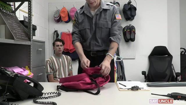 Security officer Cole Church brings suspected thief Mark Something to the backroom for questioning. When officer Church searches his backpack he finds the stolen comic books, so he then submits him to a deep cavity search. In order for Mark to go free without repercussions, he must first get on his knees and suck on the officer’s cock!