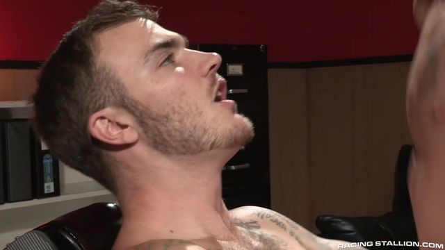 Christian Wilde and James Ryder hang out at the tattoo parlor, but these tatted studs are looking for a different kind of thrill. Christian kicks back in the chair and James gets down to do some deep cocksucking. When James finally comes up, gasping for air, Christian reels him in by his nips for a kiss before taking James' cock in his own mouth. Now James is sitting ass-up in the chair; Christian's cock disappears into James' tight hole and creates a connection between the two that penetrates as deep as the ink under their skin. Christian ends up behind James, putting him in a headlock as both men approach orgasm. Finally they blow their loads and Christian cleans up by coating James' lips with cum.