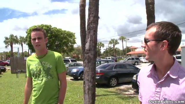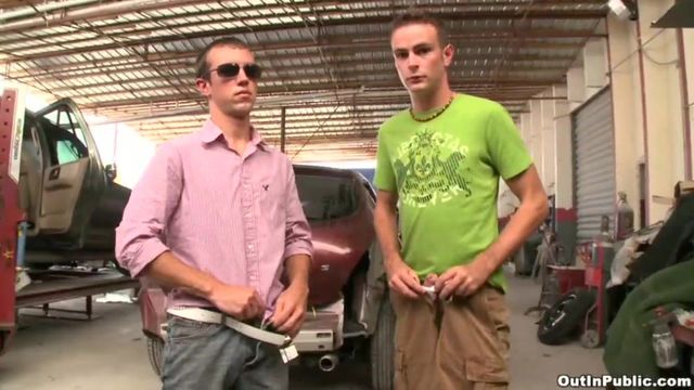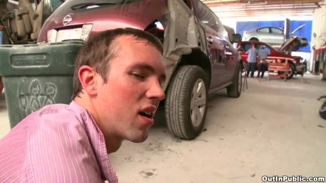 Joey has a friend who came down from Orlando for a little fun. His name is Logan and Logan is looking for some tight ass to work out. They come across Matthew who's also from out of town visiting friends. Did you know that most people will do almost anything for some cold hard cash? Joey offers Matthew some cash to suck Logans cock. Hesitant to do it in the shopping center where they met, Logan convinces Matt to head behind the stores where they find an Auto shop. Would you believe they actually sneak in to the shop and fuck right in the midst of a bunch of mechanics?! Joey's fucking nuts!