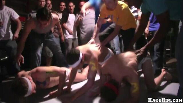 - Description: So this week we received some footage from a west coast fraternity, i guess Greco Roman wrestling is big on the west coast these dudes had to wrestle each other and the loser of the three got the loosing end of the stick. unfortunately for him he had to suck the other brothers dicks and walk around with a furry hat wedged up his ass. it was a funny sight to see what these crazy college guys would do.