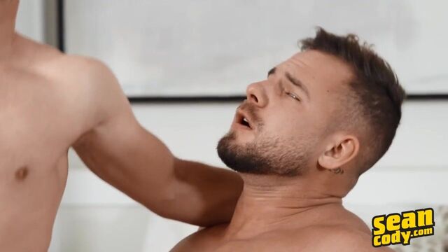 Jackson is hungry for bearded hunk Josh and can't wait to get his hands and mouth on him. They kiss passionately and undress each other in the bedroom, and Jackson gets to his knees to swallow Josh's dick. Jackson plays with their cocks together, then rides Josh before taking a pounding in missionary and piledriver. But Jackson's not done after he cums from that hard dick in his ass and takes a facial: it's time for a flip fuck so he can get his fill of Josh's tight hole too!