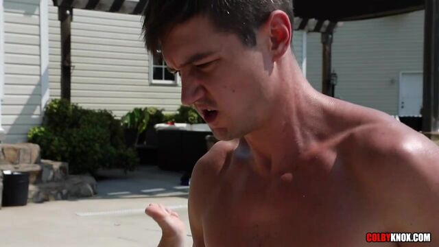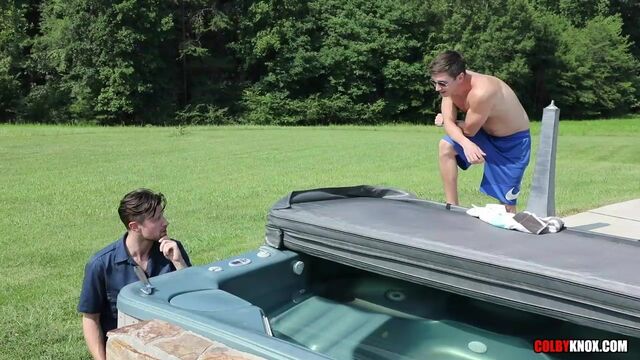 - Description: In this week's ColbyKnox video, British hottie Drew Dixon plays a repairman. He's working on the hot tub by the pool. "This is fucked," he says to Colby Chambers. "You have a leaky seal here." Colby laughs. "You're like the fourth guy we have had out to try to fix it." "The reality is you just need to replace the whole thing,” Drew suggests. Colby isn’t ready for that. Yet. "If there's anything you can try today, give it a try,” Colby says. “If not, no big deal. We'll have you guys come back out and replace it if we need to." Colby walks to the pool and Drew returns to work. The way Colby shows off his swimming gear it’s clear he’s into Drew. The repairman, however, is busy. He’s not even paying attention when Colby shows a little ass. Colby turns around, the trunks can barely contain his large piece. Colby strokes himself, looking right in Drew's direction. Alas, nothing. Drew keeps working. His boss should give him a raise for being so diligent. Colby shows all his meat. Swings it and his arms. Nothing. Finally, he walks over. His engorged penis leading the way. "Hey. I've been trying to get your attention for the last 10 minutes," Colby says. Drew looks up. "You should have said," he replies. "Come on. Take a break," Colby instructs. "You're the boss," Drew answers. He gets up and the studs make out. Colby rips Drew's shirt. "Suck my cock for me," Colby commands. Drew gets on his knees and opens wide. He grabs Colby's nuts, slurping on the shaft. "Fuck, it's good," Drew says looking up at Colby's. Colby face fucks Drew; he gags and gurgles, loving every inch down his gullet. "Suck my cock,” Colby orders. "Fucking gag on it." Drew’s throat needs a rest, so he presents his ass to Colby. Colby eats that boy hole, slapping a butt cheek. "Yes, baby,” Drew moans. “Feels good. Spit on that ass." Colby makes that hole wet and slick. When he stands up, he puts spit on his dick head. Colby slowly parts Drew's cheeks apart. Once the repairman is used to the thickness, Colby picks up the fucking speed. "Screw your tight fucking butt," Colby mutters. The pounding is furious and to the balls. "Your cock is good," Drew sighs. The afternoon tryst moves to the pool. This time Drew is on his back. "Fuck that hole," he says. Colby maneuvers Drew so his knees are parallel to his chest. "That's good. Fuck my hole," Drew whispers. "Lay you out on my pool deck and turn you out," Colby says. Both studs are so close to coming. Drew pops first, his juice landing on his stomach. "Fuck, yeah. That's so hot," Colby says. He cleans up the cum with his fingers, feeding Drew. "Taste so good," he says. It's Colby's turn to nut so the repairman gets on all fours. "I'm going to fucking flood your guts with cum," Colby informs as he returns to Drew's hole. “I’ve been edging all fucking morning." The ramming continues. "Stretch that asshole," Drew groans. "You're so fucking deep. Pound that hole." When Colby cums he doesn't pull out. "Fucking breeding you," he utters. When he finally pulls out a plentiful cum deposit bubbles out, coating Drew's hole and balls. "Sounds like you need a pool boy,” Drew says as Colby falls back in the pool. He might. But for now Colby and Drew got what they needed. What about you?