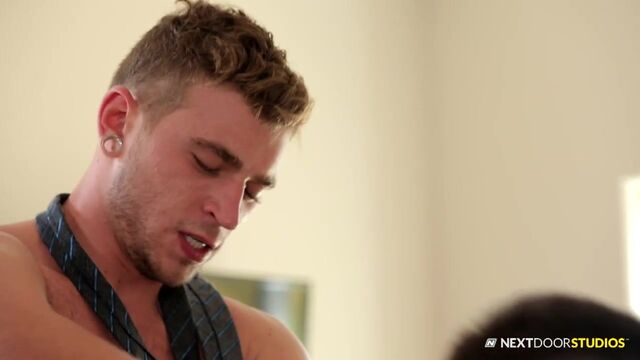 Realty is a cutthroat industry, and a good agent will do whatever he can to close the deal. Abel Archer lives by this mantra, and it has served him well. Alex Greene is still learning the ropes of the industry, but the up and comer has got Abel's attention, for more reasons than just business, so when the two of them arrive at the same listing, there is more than just comptetitive juices flowing. Alex can sense Abel's scheming ways, but he really wants the commission from this listing, so when Abel makes him an offer to 'share interests', Alex stands firm in attention.Luckily, that's just what Abel has in mind, as he drops to his knees and unzips Alex's pants, letting his massive cock fall out of his shorts and taking it deep into his mouth. Abel downs the cock in front of him as Alex fucks his mouth, gagging Abel with his length before flipping him over onto the bed and moistening up Abel's hole. Abel bends over as Alex preps him for penetration, and he's rock hard as his protege' licks him up and down, pulling out his cock and shoving it into Abel as he crouches on the bed. Alex fucks him hard, grabbing his tie and holding Abel in place as he continues to pound away, then they flip and Abel rides Alex's meatstick to his heart's content, grinding on Alex's rod as his ass slaps Alex's stomach.Alex flips Abel around one last time, hovering over him as he thrusts his dick in and out of Abel's sated body, pulling out to blast Abel with a load to the face that drips from his lips and down his chin.Enjoy!