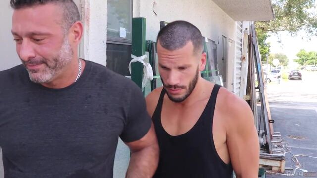 Construction worker Alex Tikas helps his hung adopted cousin Marco Lorenzo by giving him a much-needed job: sucking and serving his cock with his ass.