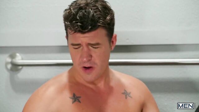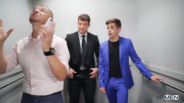 When JJ Knight spots his boss in the elevator he decides to seize the opportunity to present some of his brave new ideas about capitalizing on the expanding market and squeezing ever greater quantities of surplus value out of the company's work force. JJ's boss tries to brush him off, but sexy twink assistant Joey Mills encourages the boss man to hear the stud out. With the boss still in the elevator, JJ and Joey start fooling around, stroking each other's cocks while the big man's back is turned. Unsatisfied with hand play, Joey seizes an opportunity of his own, letting the elevator doors close on him to create a dangerously sexy office crisis. JJ pulls down Joey's tasteful office slacks and gives him a deep pounding in the elevator, rimming his hole on a handstand and driving Joey wild.