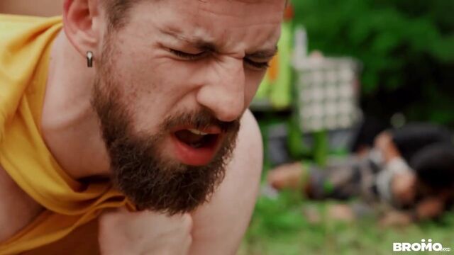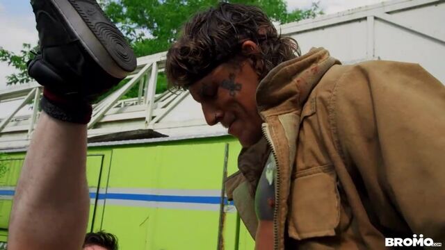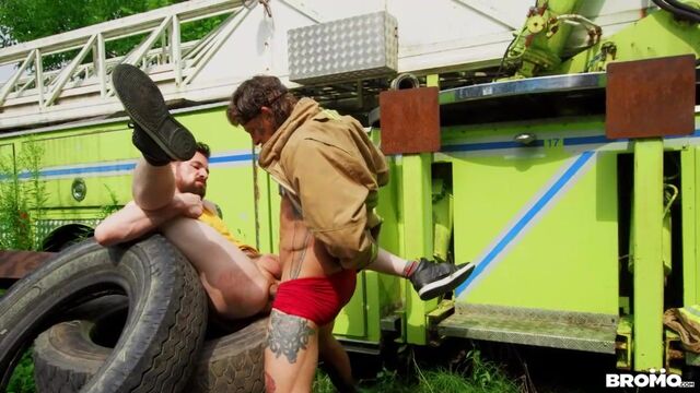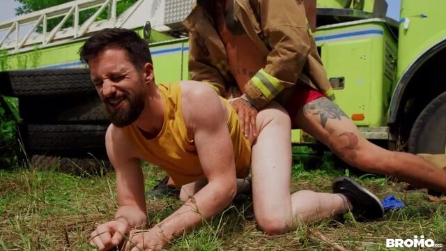 When Thyle Knoxx ignores Bo Sinn to flirt with a fireman washing his truck, Bo knows there's only one solution: tie up the firefighter and steal his uniform! Once Bo's wearing the iconic pants, with the fireman's jacket open to show off his muscular chest, Thyle rubs Bo's bulge and kisses down his hard abs, then pulls out that big cock and sucks it. Bo pushes Thyle up against the side of the truck to fuck him from behind, and the bottom rides him on the running board. Thyle gets on his hands and knees in the grass to get "fire drilled" in doggystyle position, then Bo fucks him nice and deep on a stack of tires before cumming all over his hole.