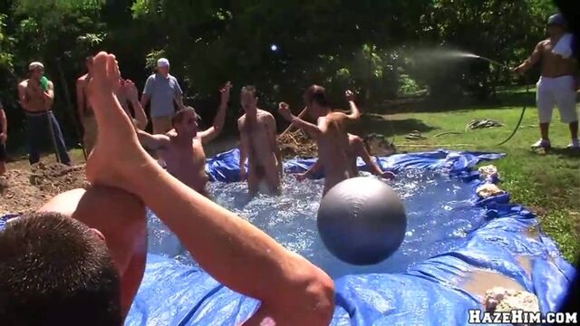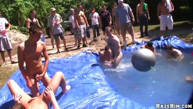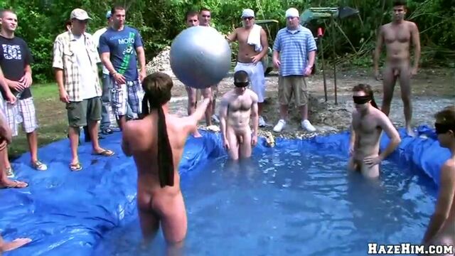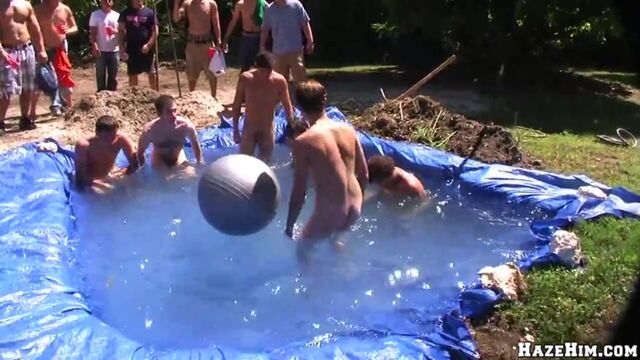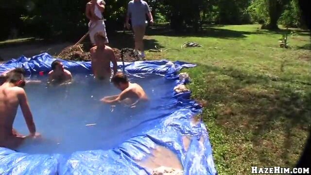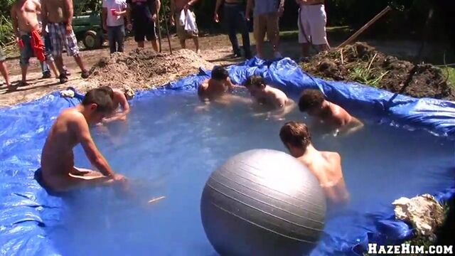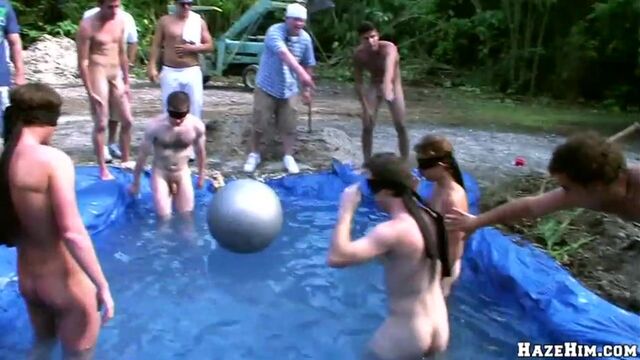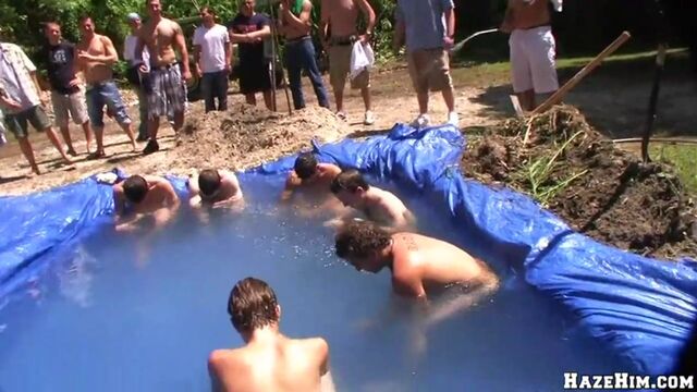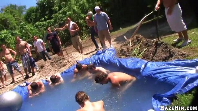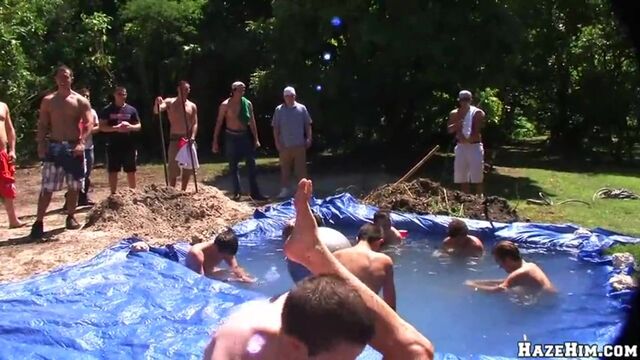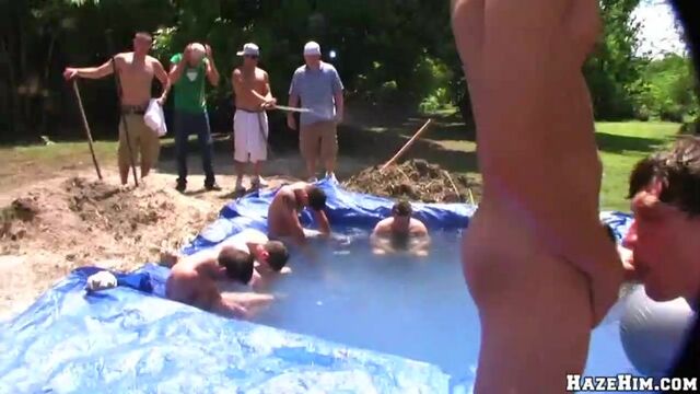 - Description: there is nothing like a nice summer time splash, especially when the pool is man made and ghetto rigged as fuck! these poor pledges had to play blind folded in this hole in the ground filled with water. The winners of course were excempt from hell week but the losers had to pay the ultimate price! I mean its not embarrassing enough playing naked in a nasty fake pool. as punishment for losing these unfortunate pledges had to suck each their off in front of their brothers and fellow pledges.