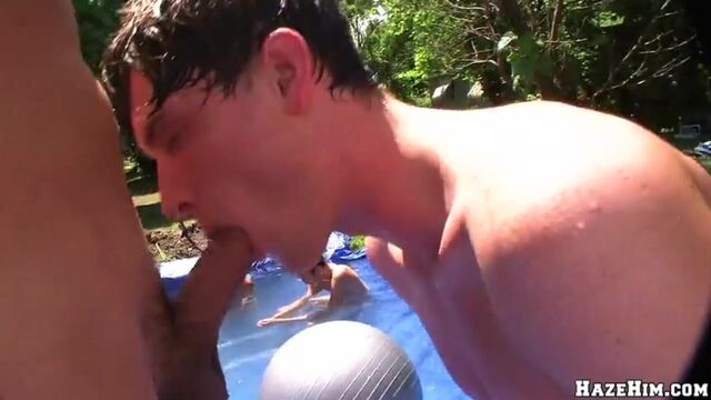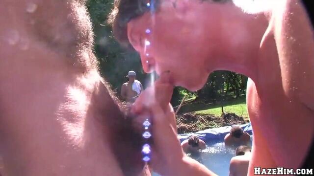 there is nothing like a nice summer time splash, especially when the pool is man made and ghetto rigged as fuck! these poor pledges had to play blind folded in this hole in the ground filled with water. The winners of course were excempt from hell week but the losers had to pay the ultimate price! I mean its not embarrassing enough playing naked in a nasty fake pool. as punishment for losing these unfortunate pledges had to suck each their off in front of their brothers and fellow pledges.