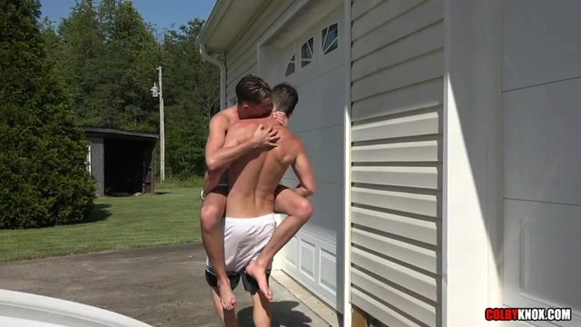 There's a pool party at the ColbyKnox compound. People are lounging and drinking. Even the dogs are having fun. Grayson Lange, wearing sexy pool wear, gets out of the water. He strides over to Colby Chambers, giving a subtle hint that Colby should follow him behind the house. When they are alone there is an intense make out session. Colby picks up the hottie, carrying him to the gym. Once there, Colby leads Grayson to a fitness bench. He pushes Grayson down so he can lick the boy's hole. "Oh, fuck," Grayson moans. "Eat my ass. Fuck, yeah." Colby licks that hole right, getting it juicy. "You want it," Colby asks. The answer, of course, is yes. Grayson gets on his back, spreading those fine legs. Colby fills him up in one swoop. The fucking is short and powerful. "Oh, yeah," Colby moans on a down stroke. "Give me that tight ass." "Oh, yeah. Fuck that tight hole," Grayson responds. He slides off the bench, ending up on a mat. Colby's dick stays right where it wants to be: inside of Grayson. The two studs change positions. They are standing and Grayson leans against a freestanding punching bag. Colby is right behind him. "Fuck yeah, Grayson," Colby mutters. "Fuck! That ass.” Colby grabs Grayson's hair. "Do you want my dick," Colby asks. "Fuck, yeah," Grayson breathlessly replies. "Fuck you in that tight hole," Colby says. "Fuck. It feels so good," Grayson groans. The pounding is balls deep. Before long Colby pops a nut, flooding Grayson's guts. When Colby pulls out cream lands on the floor. A string of seed stays attached to Grayson's butt cheeks. All of that fucking has made Grayson hot and bothered. He jerks a copious load as he kisses Colby. After both calm down, they get dressed and head back to the party. Troy Accola pops out of a door to a store room. "Hey, Colby? Can you help me find the Sprite? I can't find it." Colby promises to help. When Troy closes the door, his smile says it all. His thirst requires more than soda. He leans on a three-wheeler, pulling his shorts down. When Colby returns, Troy shakes his perky ass cheeks. Colby smiles; he gets behind Troy, grabbing one ass cheek and offering a kiss. He pulls Troy's shorts all the way down and puts some spit on his johnson. "Yeah. Take my cock," Colby orders as he fills Troy up. Troy moans, receiving every inch. "You have a hot fucking ass," Colby says. Troy smiles when Colby slams his special spot. "You like my dick in your ass," Colby asks. "Yeah. I fucking love it," Troy whispers. "Been thinking about it out there by the pool," Colby wonders. "Oh, yeah," Troy replies. He puts a hand on a cheek. "Yeah. Spread those cheeks," Colby demands. "It feels so good," Troy sobs. He can only handle so much dick before busting. He does, splattering seed all over his hand. Colby doesn't stop fucking. "Want me to breed you," Colby asks. "Oh, yes please," Troy responds. Colby's second load coats Troy's insides. "I feel it," he sighs. "Take my fucking cum," Colby groans. Some of Colby's man milk dribbles out, landing on Troy's taint. Colby pulls out, jerks his meat, and re-enters Troy. "Oh, yeah. Push it in," he sighs. "Put it deep in you," Colby says. He pulls out and the two are covered in sweat and cum. Colby wants to know if Troy still wants that Sprite. "I'm not thirsty anymore," Troy notes. Maybe not but he’s certainly refreshed!