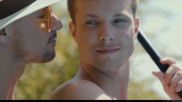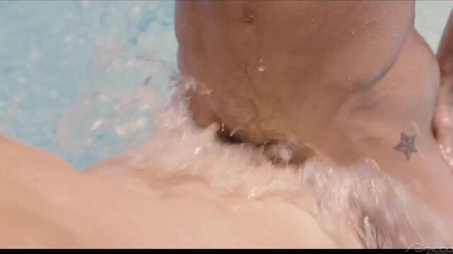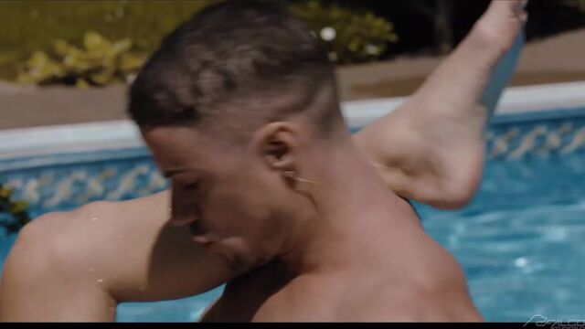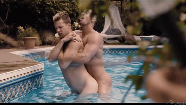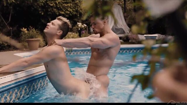 Muscle man Skyy Knox is ready for a swim, but he needs pool boy Benjamin Blue to clean up the pool first. Seeing the hardworking Benjamin in his revealing uniform quickly makes Skyy forget about swimming and shift all of his attention to the pool boy's hot body. Skyy rests on the pool's diving board as a now-naked Benjamin gobbles down his cock with his eager mouth and open hole. After moving into the water, Skyy's intense bareback thrusting into Benjamin's smooth ass creates massive waves that resonate throughout the entire pool. Benjamin yells that he's close moments before erupting all over Skyy's tight abs. Now fully drained, the bottom moves to the shallow end of the pool to receive a cum facial from Skyy's oversized cock.