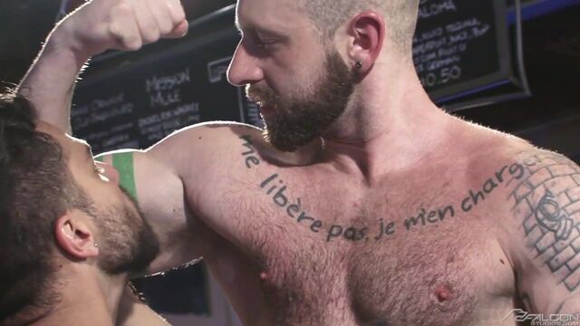 Adam Ramzi walks into Aleks Buldocek's bar throws his bag down, sits on a barstool and asks for 'something strong.' Aleks sees a handsome, athletic guy in plaid flannel with abundant chest hairs curling out of his unbuttoned shirt. Adam sees massive pecs and a torso covered with ink and fur. Their hands slide over each other as Aleks pushes a shot glass across the polished wood. When their eyes meet, Aleks knows Adam wants something stronger than a shot. Aleks sits on the bar and guides Adam's head while he sucks. Adam straddles a bar stool, hanging his ass over the edge for Aleks to eat and fuck. Adam's hot ass cheeks are white and covered in barely visible hairs that darken and thicken towards his crack. They bang hard, kiss, then resume fucking with Adam on his back, his tight abs clenching into symmetric ripples with Aleks' every thrust. Adam worships Aleks' nipples, pecs and biceps with his tongue. Their lips meet for a final hungry kiss as they blast out streams of cum.