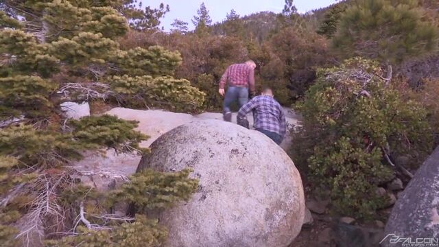 After a hike in the brisk mountain air, Angel Rock and Nick Sterling get warm in the bathtub. They have matching chin beards, beefy bodies and torsos sprinkled with dark hair. While they kiss, Angel's fat cock, fully erect, beats its demands against Nick's flesh. It dominates the scene. Nick responds with an open mouth, engulfing Angel's column; his throat expands and constricts as he swallows and releases, and swallows again. Angel twists Nick's nipples as if they were dials to turn up the heat, then he spins Nick around to get at his buns, licking and probing them until they're dripping with saliva. Nick gasps when Angel stands and plunges his cock into him, and they surrender to a splashy, two-position fuck. On the verge of orgasm, Angel collapses on the edge of the tub. He expels gobs of cum that drip down Nick's lips and chin and which he smears all over Nick's face with his cock as Nick erupts onto his stomach. They share a kiss that's wet with Angel's spooge.