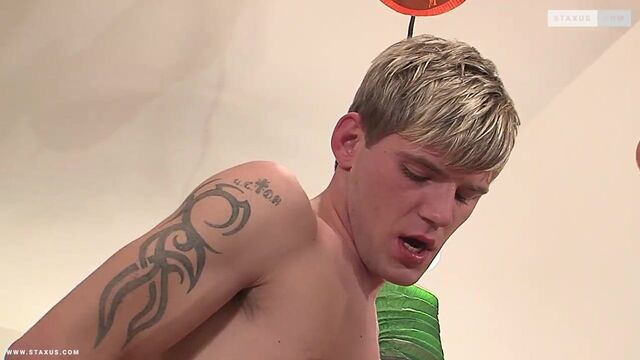 It’s not exactly altogether surprising that Thomas Dyk and Tony Koch clearly both have Luk Anders in their sights. This blond Russian bombshell is exactly the kind of fellow that would instantly attract most of the gay population of Prague – not to mention beyond! – and the fact that we’re talking about lads like these two horned-up buddies makes some kind of sexual interface nigh on inevitable. Indeed, so it quickly proves; with an innocent game of Foosball very quickly descending into a no-holds-barred triple fuck-fest between three of the hottest, horniest boys in the Czech Republic.Of course, there’s no denying the fact that Dyk is the star attraction here – he’s the most easily recognisable of the three, with the kind of libido to die for, and he doesn’t disappoint. But in terms of raw masculine drive it’s Anders who makes all the headway; and it’ll come as no surprise to see him pounding first Koch’s tight little pucker, then Dyk’s arguably much more well-used hole! Needless to say, both bottoms seem to have the time of their lives as they take it in turns accommodating all that Russian salami; before Dyk re-establishes himself as the star turn, sucking on Koch’s grossly swollen ramrod whilst Anders continues to pummel his butt.It’s a high-octane show that thrilled gay audiences when first released in 2006, and which has lost little of its cum-inducing impact almost a decade later; with Dyk ultimately receiving a tsunami of pent-up spunk all over his body, whilst jerking a characteristically ferocious eruption over his belly for another STAXUS classic!