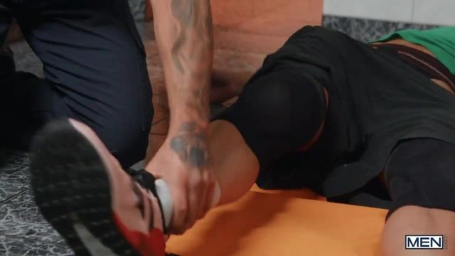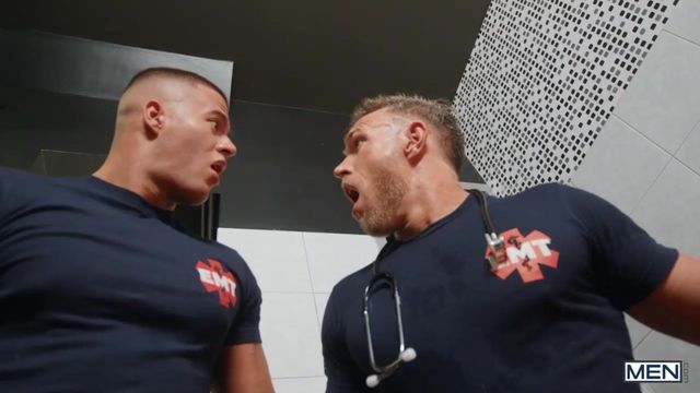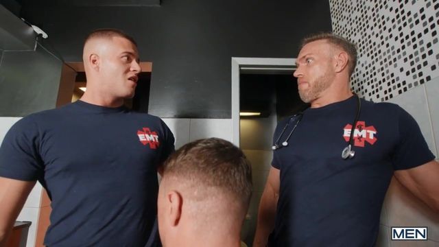 After Skyy Knox slips in his own cum and passes out on the bathroom floor, paramedics Alex Mecum and Clark Delgaty have to shock him to bring him back, and he wakes up horny and craving cock! Skyy pulls down both hot EMTs' pants and sucks their dicks. Skyy blows Clark while Alex rims him and fucks him doggystyle. The tops switch spots as Skyy rides Clark on the floor and sucks Alex, then take turns penetrating him missionary on the counter till Skyy cums and they paint his face with their jizz!