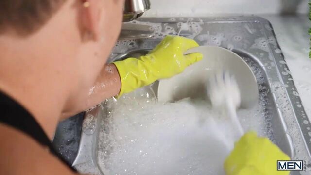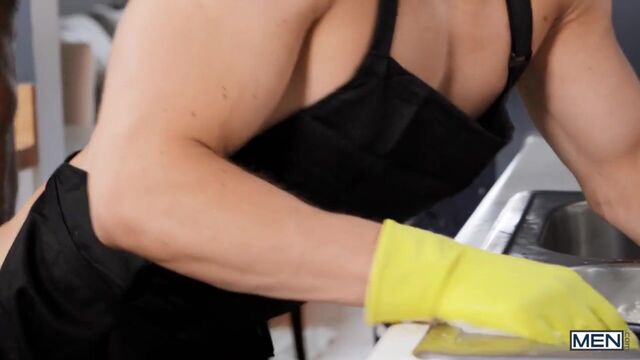 Gorgeous nude Felix Fox wanders into the kitchen in the morning and straps on an apron and gloves to start tackling the dishes in the sink. His boyfriend, Slim Saint, decides to help his man out by coming up behind him and kissing him, then pressing his lips down Felix's back before rimming his hole! The dishes will have to wait, because all Felix wants is to concentrate on pleasure as Slim slides his cock inside him. Felix sucks Slim, then rides him on the floor before leaning back on the island with one leg up on the counter as Slim fucks him missionary. The bottom cums, then Felix blows the top and swallows his load.